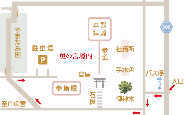 御祈祷や御神札・御守・御朱印・縁起物などは奥の宮へお参りください。