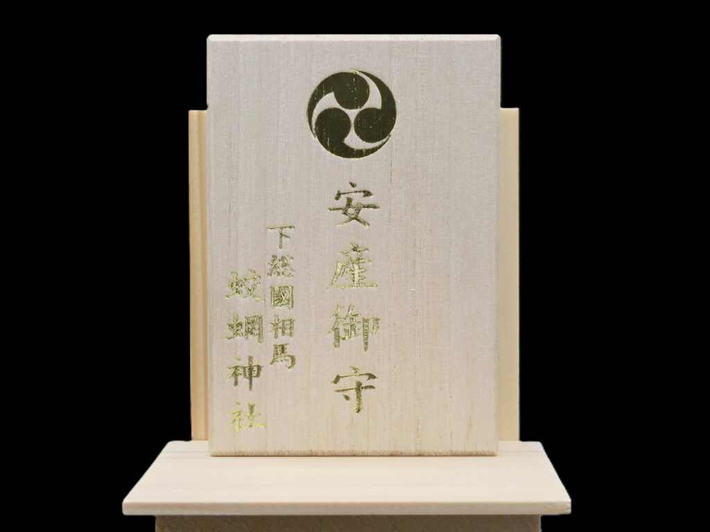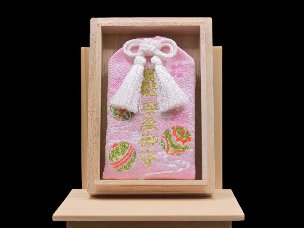 安産御守は、利根町の木の桜・まり・川の流れをデザインしました。まりのようなかわいい子が生まれ、子孫が川の流れのように脈々と続いて欲しいと願いを込めた御守です。桐の箱は「へその緒」を入れて大切にお持ちください。