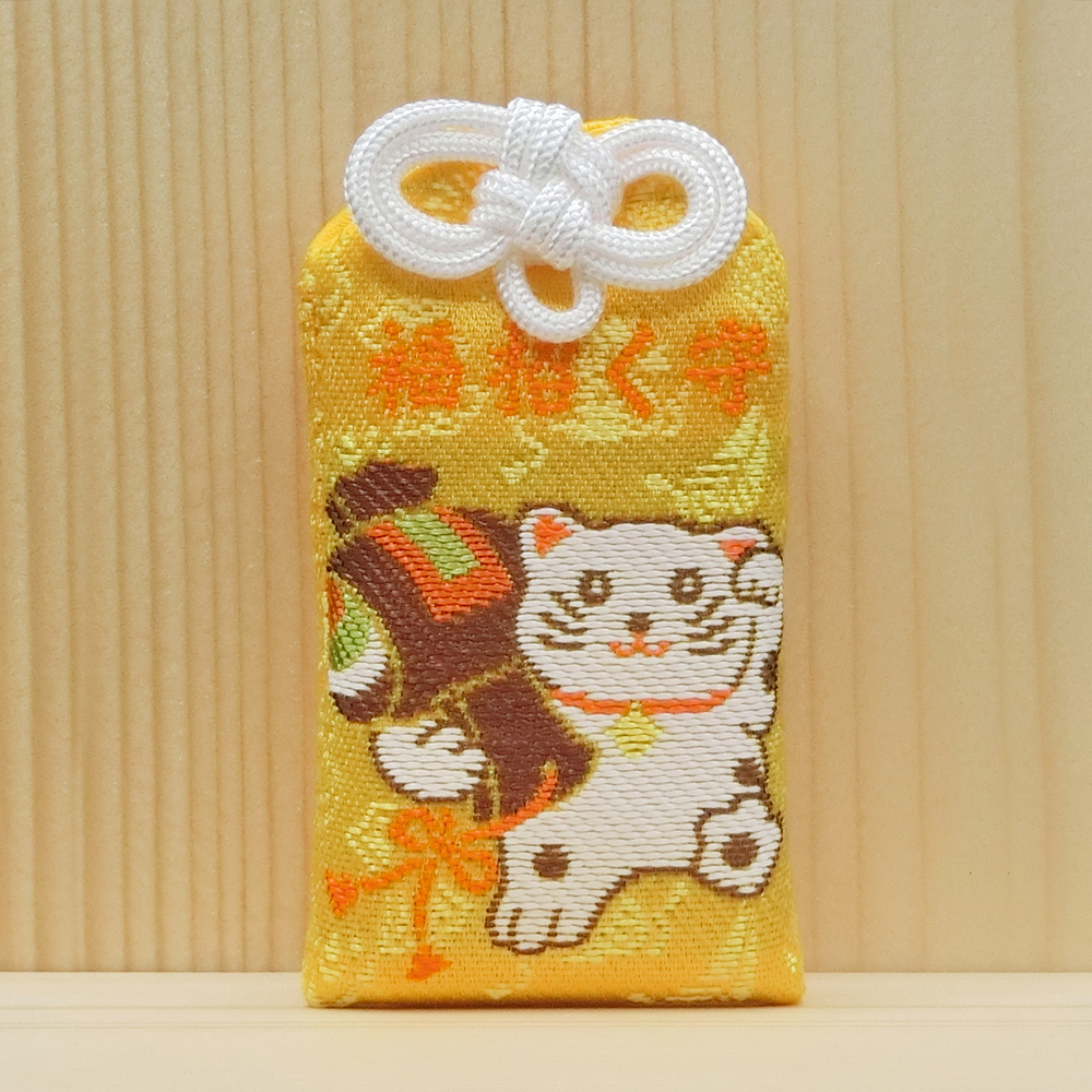 福招く守は、猫と打ちでの小槌をデザインしました。猫が左手で幸福を招き右手に大きな打ち出の小槌を抱え、目標を定めて努力し様々な願いや夢がもたらされるようにと願いを込めた御守です。
