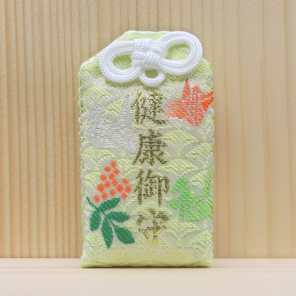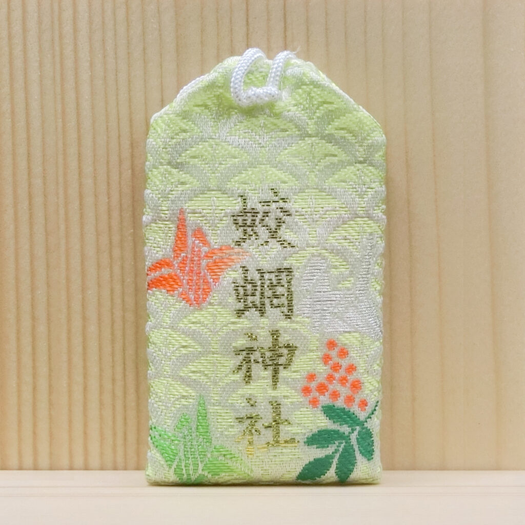 門の宮の御神木のイチョウが、秋になり黄葉し落葉した様子をデザインしました。古来、南天は縁起の良い木とされ不浄や穢れを祓い「難を転ずる」と言い伝えられております。折り鶴は日々の生活が心穏やかに元気に過ごせますようにと願いを込めた御守です。
