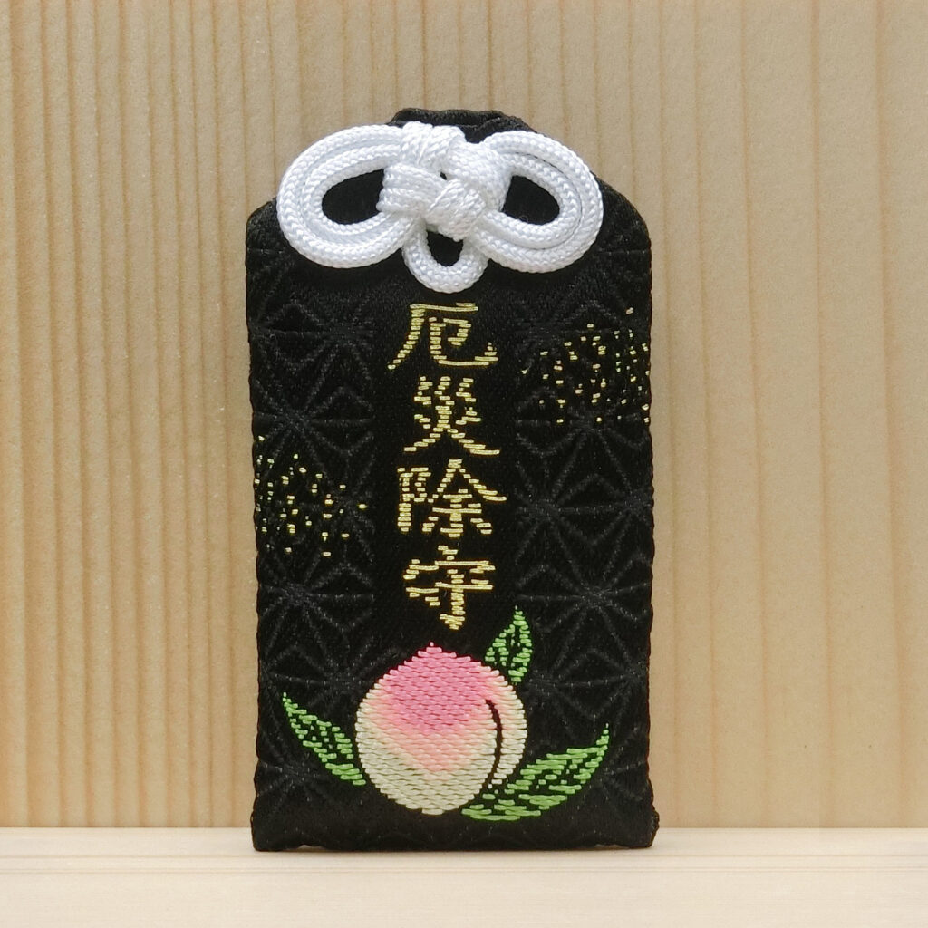 「黒+桃+麻の葉」で厄災除けの意味を重ねた御守です。