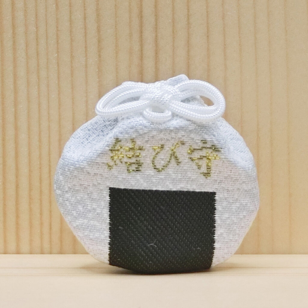 おむすびは「お結び」と表し、良縁を結ぶ縁起のよい食べ物とされています。結びには、恋愛だけではなく「人と人との縁」「仕事の縁」「欲しかった物の縁」などあらゆる良い縁を結べるようにと願いを込めて塩むすびの御守を奉製しました。のりの大きさにも1mm 単位でこだわり、米粒も織で表現しました。塩を音読みにすると……