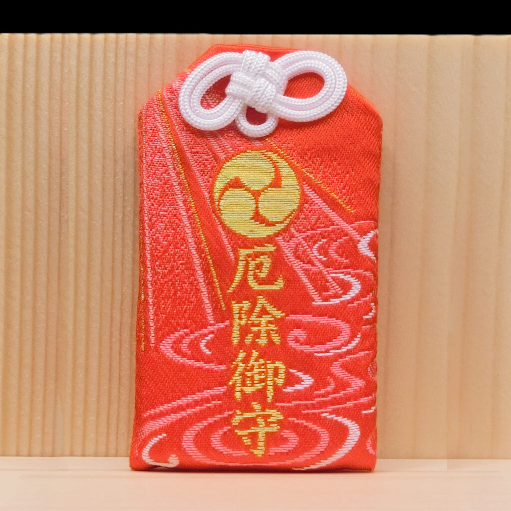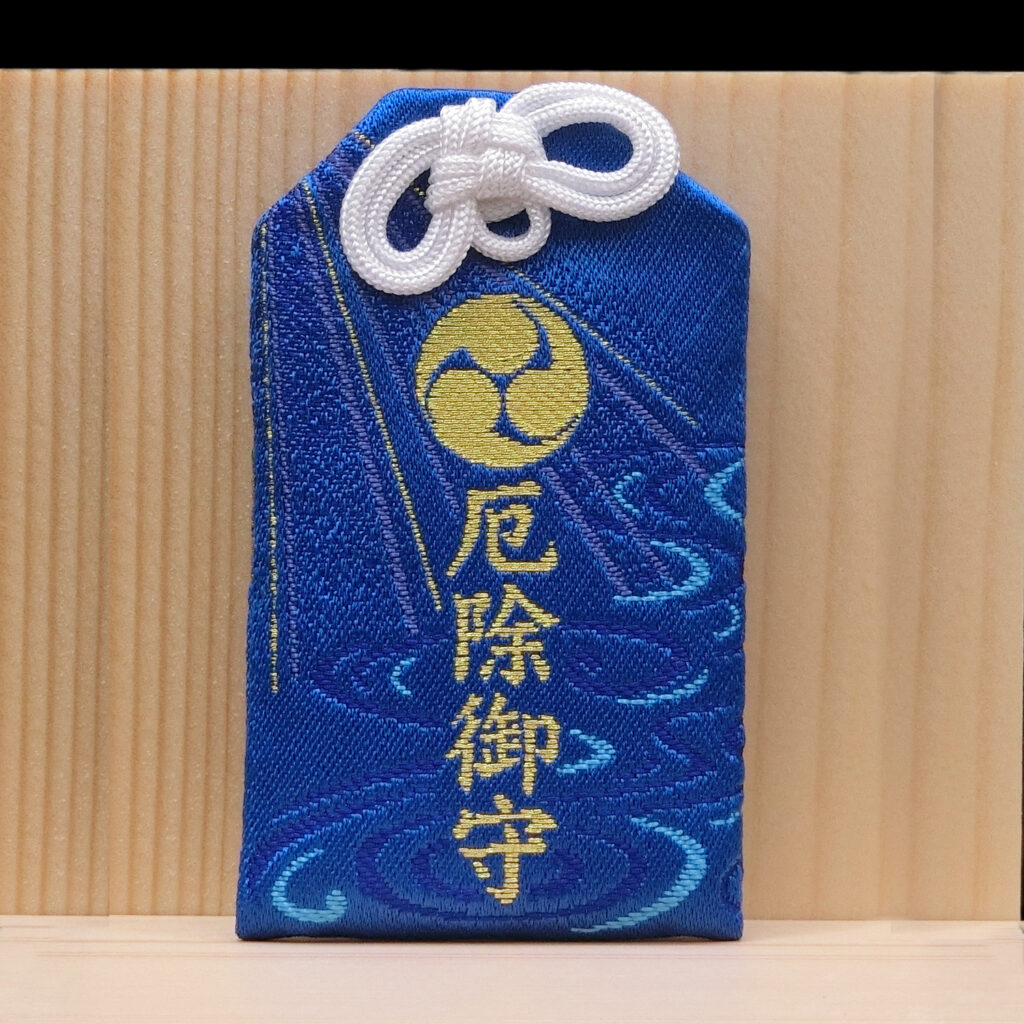 水の女神様「罔象女大神(みつはのめのおおかみ)」を主祭神としてお祀りしております。災いを薄めるように「水面(みなも)」をデザインしました。「厄年」を自覚し何事にも気を引き締め、光に導かれ前向きに行動出来るようにと願いを込めた御守です。裏面には門の宮の御神木のイチョウの葉をデザインしました。